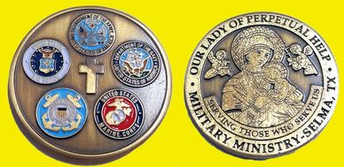 A Military Ministry Challenge Coin is provided to each military veteran. Coin is available at the monthly social.