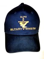 Navy blue baseball cap with adjustable headband and Military Ministry Logo are available during the monthly social. Price is $15